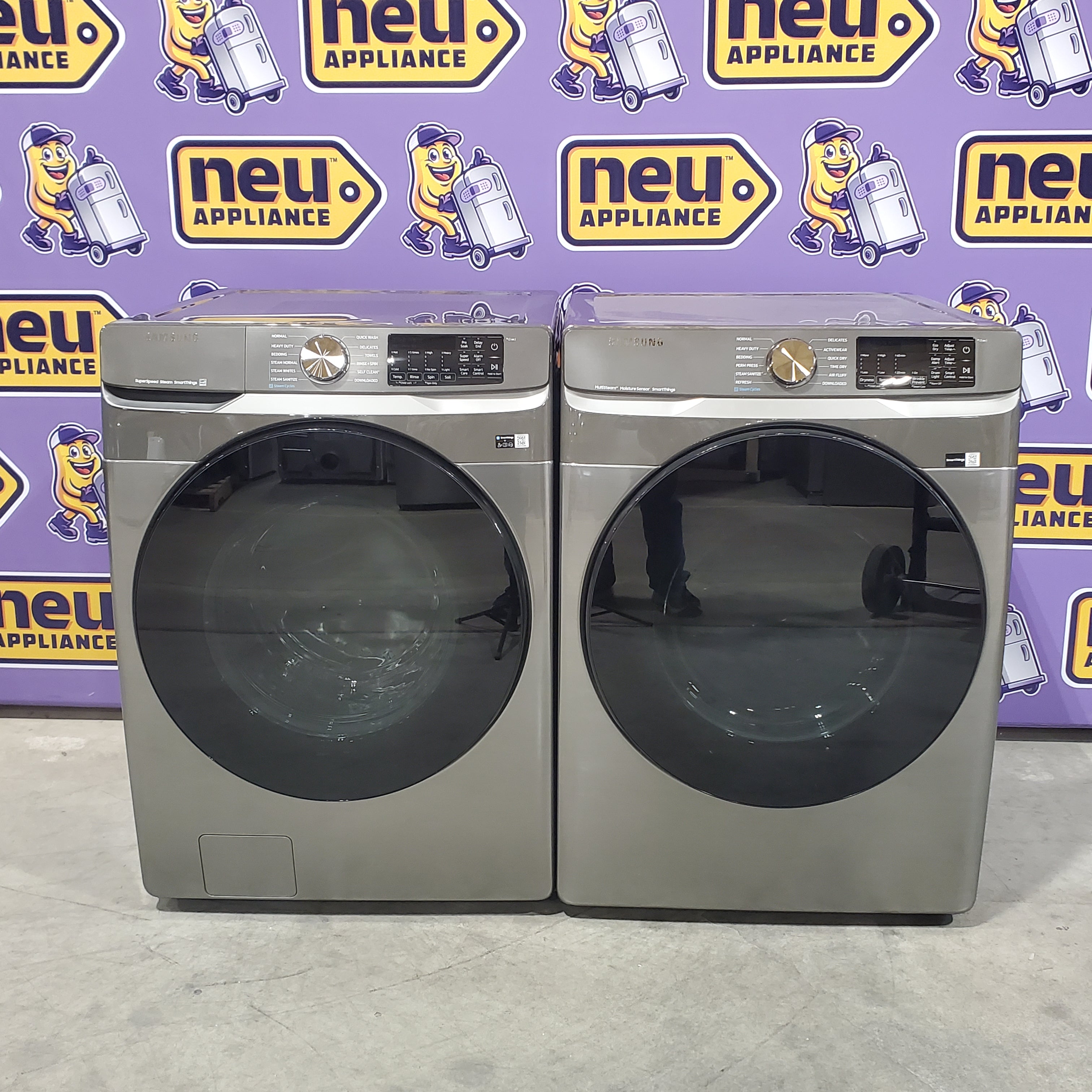 Samsung 4.5 cu. ft. Large Capacity Smart Front Load Washer with Super Speed Wash in Platinum WF45B6300AP - Scratch & Dent (Minor) and Samsung 7.5 cu. ft. Front Load Electric Dryer with Steam 16135 - DVE45B6300P - Scratch & Dent (Minor)